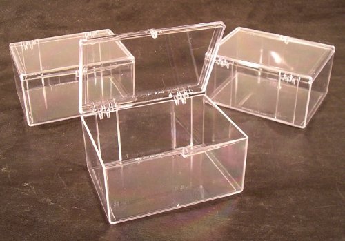 These plastic hinged card storage boxes are of the highest quality, and made in the United States of America! They are designed to hold 100 standard-sized trading cards (2.5" by 3.5"). Their inside height dimension is 1.75 inches. They feature four-ball hinges for added strength, and an extra-tight snap closure design so they won't open up accidentally. They are also quite suitable for the storage of beads, craft supplies, fasteners, small parts and the like.